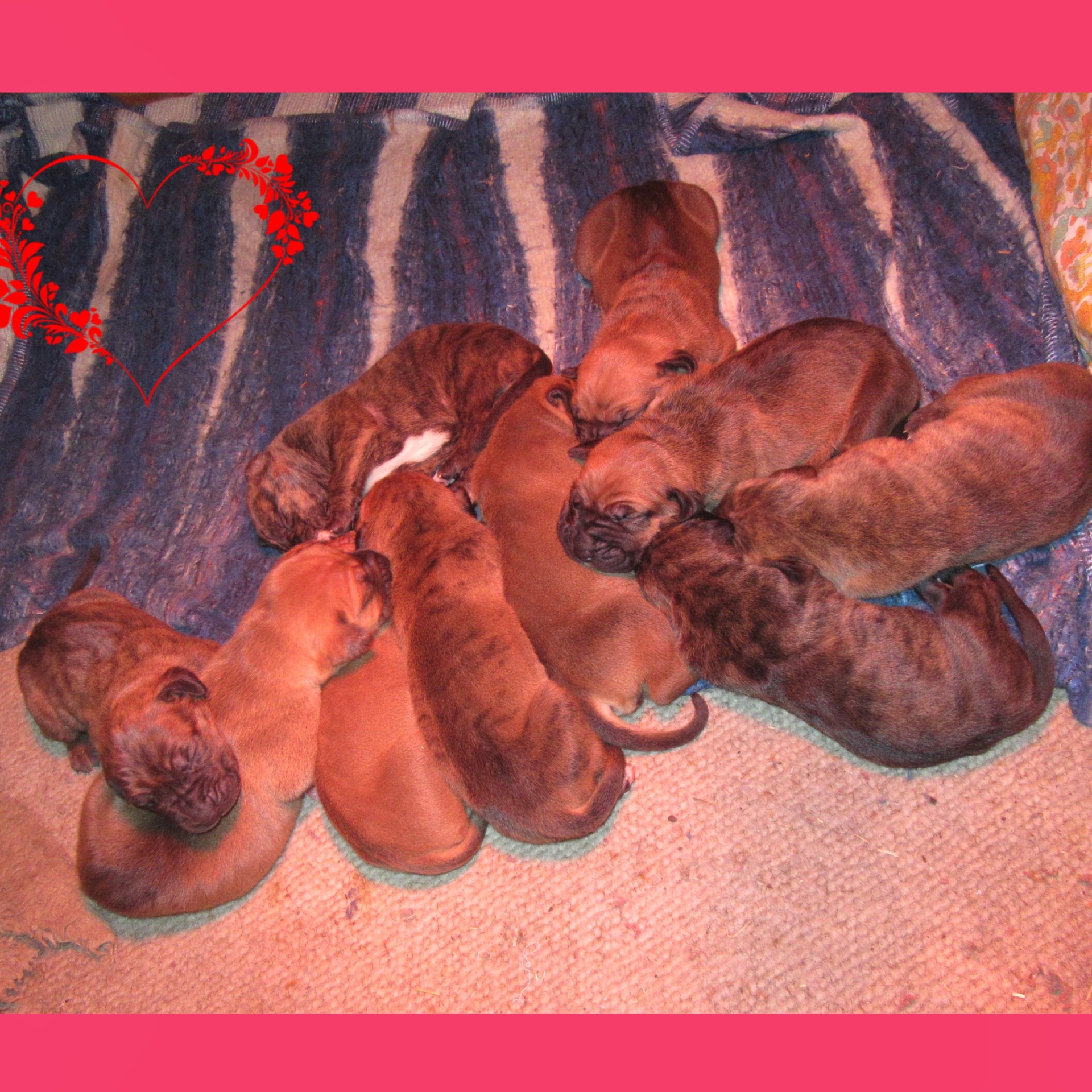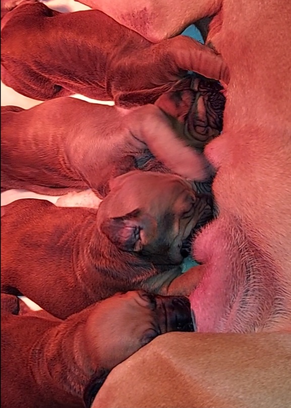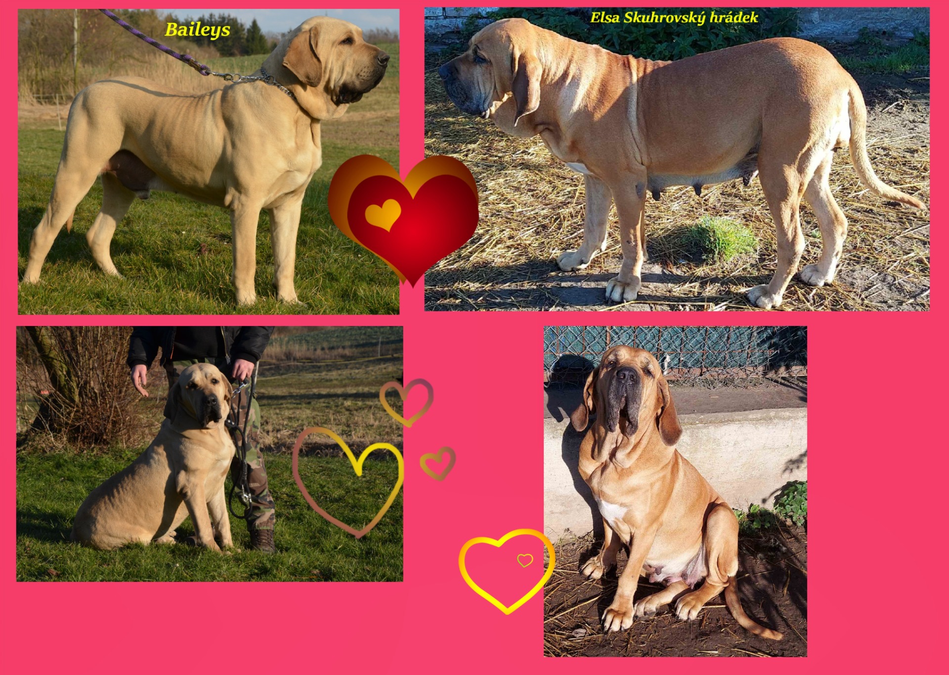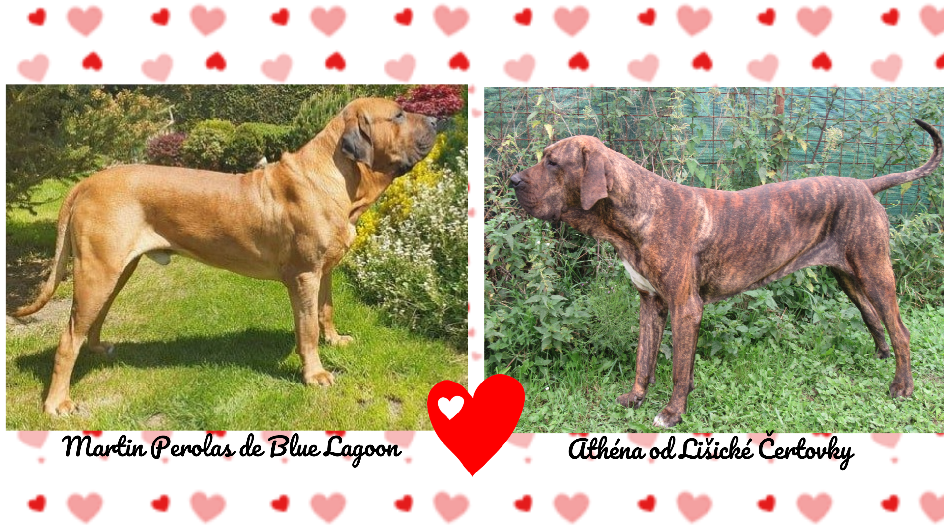 Otec je český junior šampión, světový vítěz mladých, několikanásobný BOB, BOJ, BOS, KV. Import - nová krev v ČR. Má vynikající sebejistou přitom vyrovnanou povahu. RTG 0/0, A/A. Matka 2x V1, oblastní vítěz, CAC, je ostřejší sebevědomé povahy. U štěňátek z tohoto spojení jsou předpokládané výborné výstavní úspěchy a typické ,, filí ,, povahy.